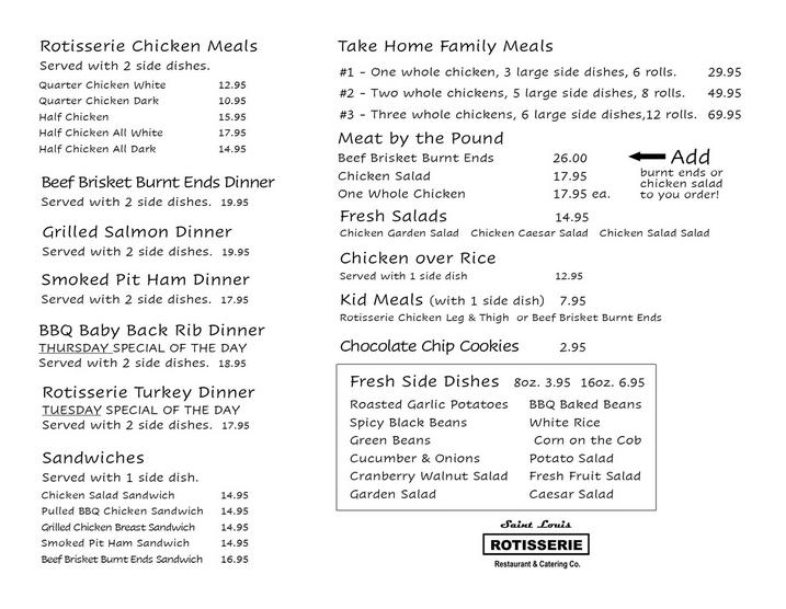 From wood-fire rotisserie chicken with roasted garlic potatoes, garden salad and fresh fruit to grilled salmon and BBQ baby back ribs, we have something to satisfy any craving. And don't forget to try our Jamaican jerk chicken. Eat In, Carry-out and catering to the entire metro St. Louis and surrounding areas.